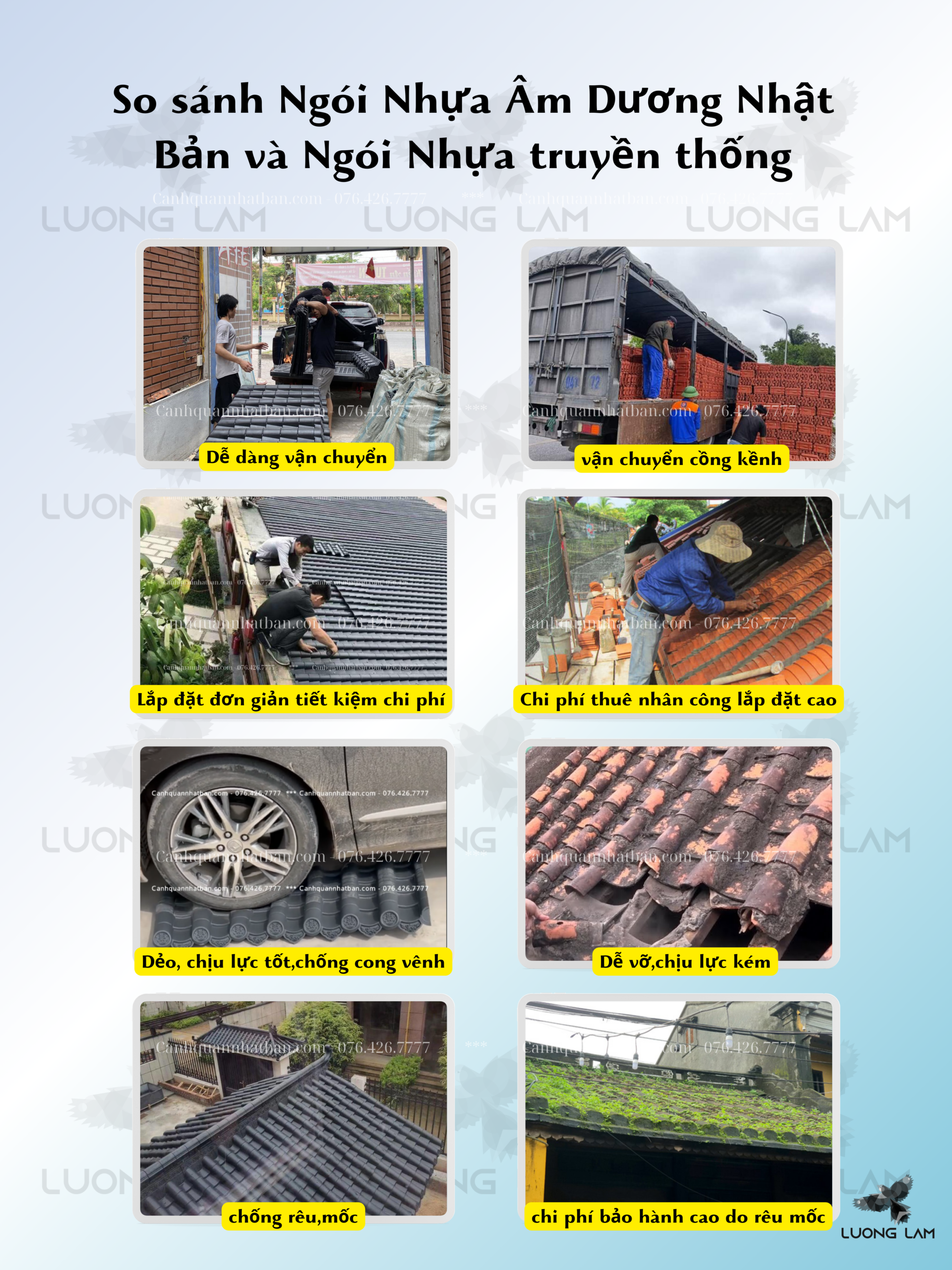 - Ngói nhựa âm dương Nhật Bản đang dần trở thành xu hướng lựa chọn mới trong ngành xây dựng và trang trí nhà cửa bởi những ưu điểm vượt trội so với các loại ngói truyền thống như ngói đất nung, ngói xi măng,… Dưới đây là những lý do khiến bạn nên chọn ngói nhựa âm dương Nhật Bản cho công trình của mình: