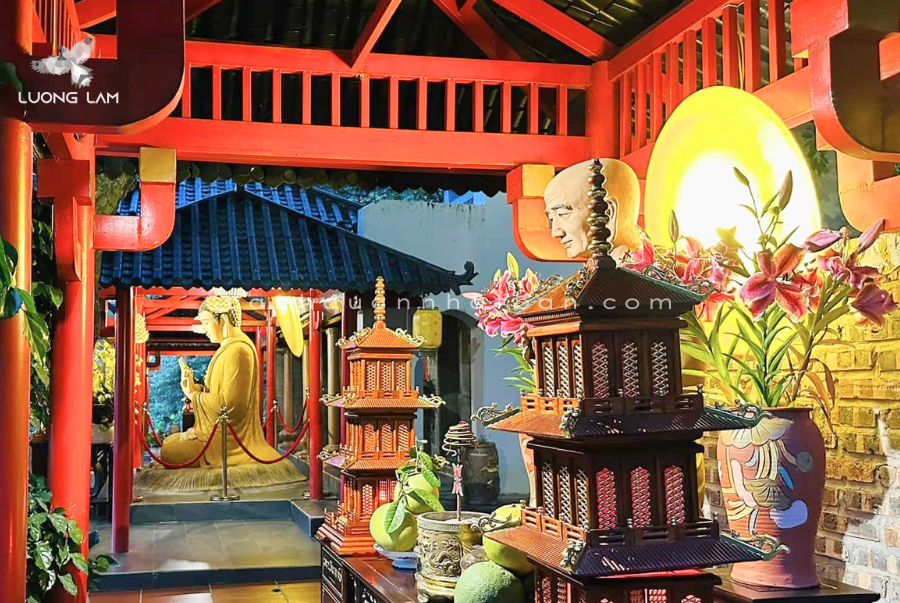 Hình ảnh trên là một ví dụ tiêu biểu cho kiểu không gian này, nơi hội tụ đầy đủ yếu tố: kiến trúc Á Đông, vật liệu hiện đại và chiều sâu văn hóa tâm linh.