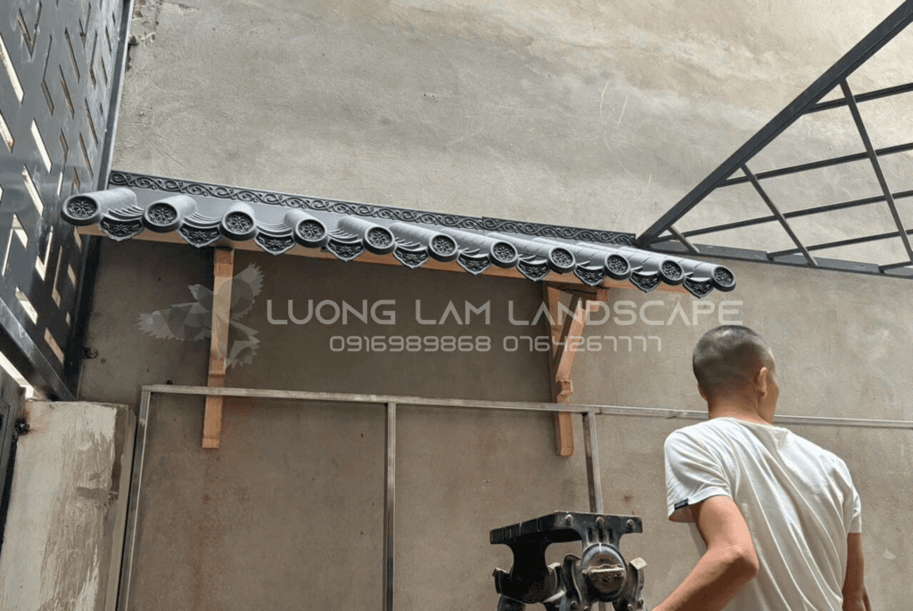 Lắp đặt phụ kiện: Chèn các loại ngói bò, cuối mái và đầu đao để hoàn thiện tính thẩm mỹ.