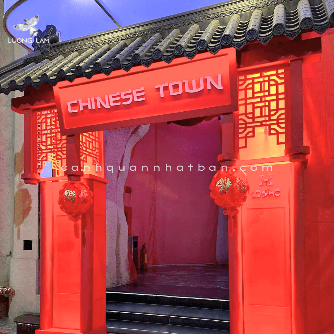 Trang trí hoàn thiện: đèn lồng, câu đối, backdrop, dây treo an toàn.