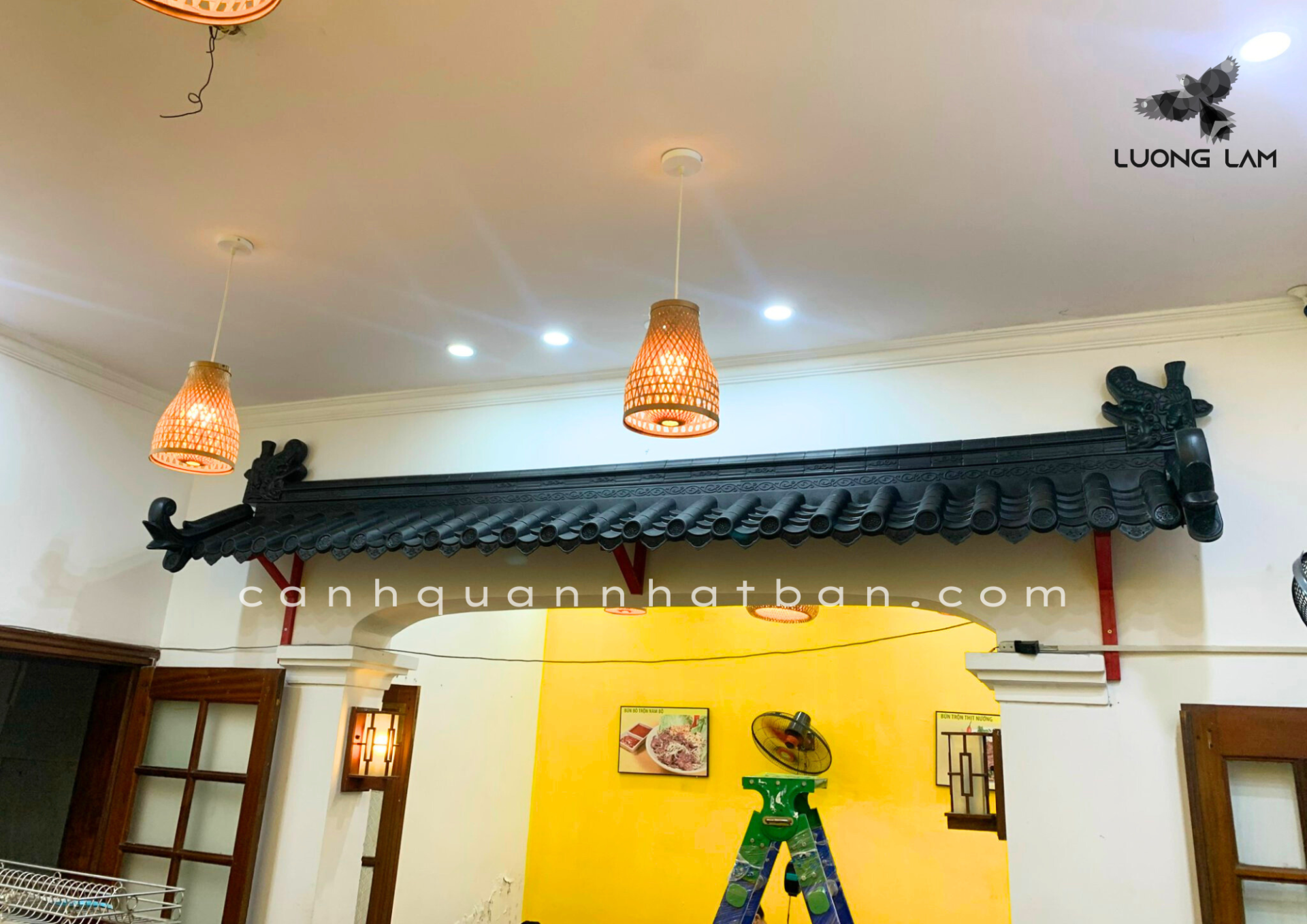 Mái hiên trang trí sử dụng ngói nhựa âm dương Nhật Bản trong quán ăn, tạo điểm nhấn vô cùng ấn tượng cho khách hàng